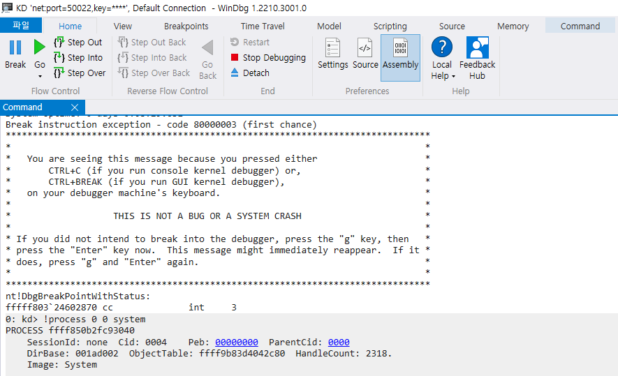 windbg -k net:port=50022,key=***를 그대로 실행시킨다.or