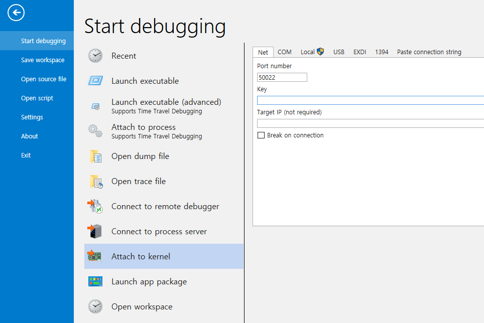 windbgx의 환경변수가 등록되어 있다면, windbgx -k net:port=50022,key=***를 그대로 실행시킨다.