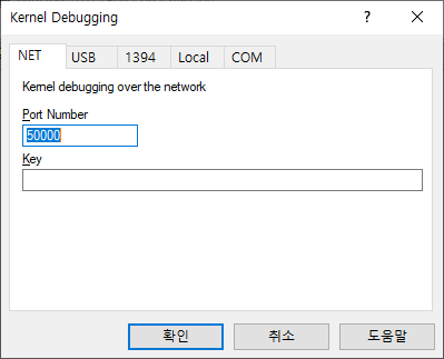 windbg를 실행시켜 [File]-[Kernel Debug]를 선택해 3.에서 설정한 포트 번호와 Key 값을 넣어서 확인을 누른다.