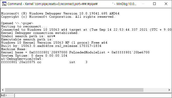 아래와 같이 windbg.exe가 올라오면, 정상적으로 커널 디버깅을 할 수 있는 상태이다.