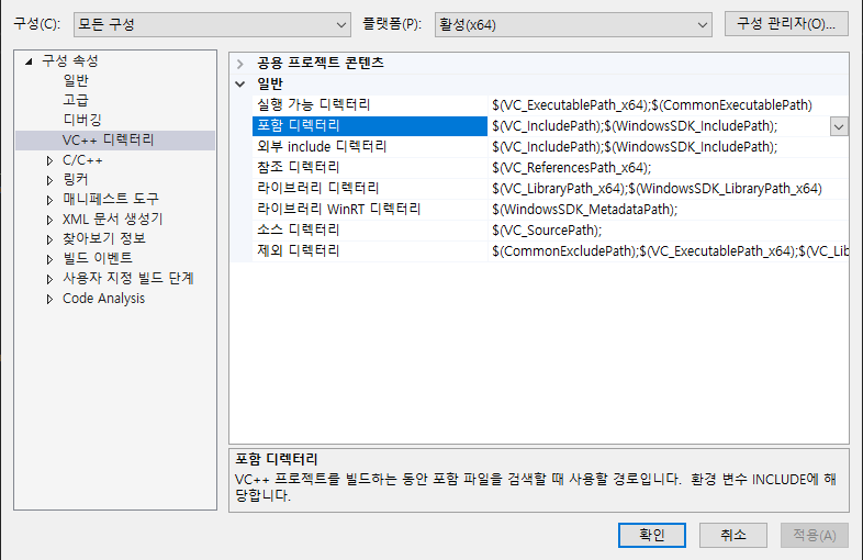 - 포함 디렉터리(Include Directories) / 라이브러리 디렉터리(Library Directories)에 각각 Include와 Lib 경로 넣어줌